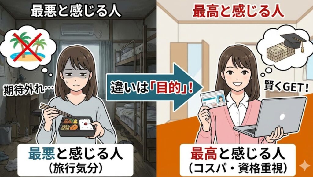 格安プランの宿舎は、リニューアル前の団地のような建物だったり、食事も「給食」のようなメニューだったりすることがあります。キラキラしたホテルライフを想像して行くと、「話が違う!」とガッカリしてしまうわけですね。