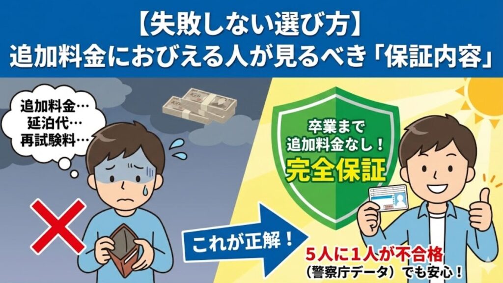 数千円高くても、必ず「卒業まで追加料金なし(完全保証)」のプランを選んでください。合宿免許受付センターは、この「保証プラン」が非常に充実しています。