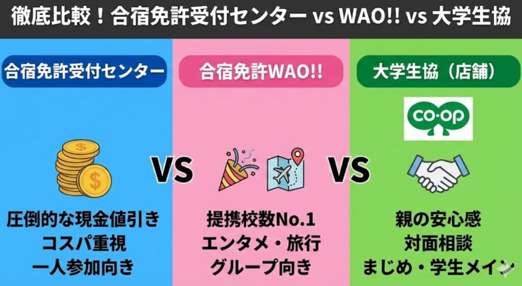 | 特徴 | 合宿免許受付センター | 合宿免許WAO!! | 大学生協(店舗) |