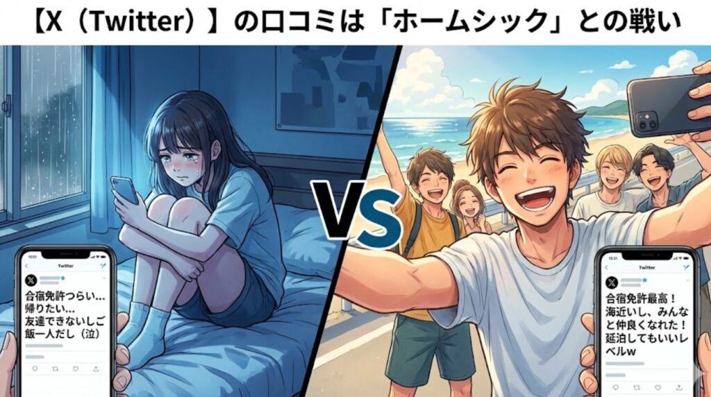 最後に、リアルな感情が垂れ流されるSNS、X(旧Twitter)です。 検索窓に「合宿免許受付センター」や特定の教習所名を入れると、悲喜こもごものツイートが出てきます。