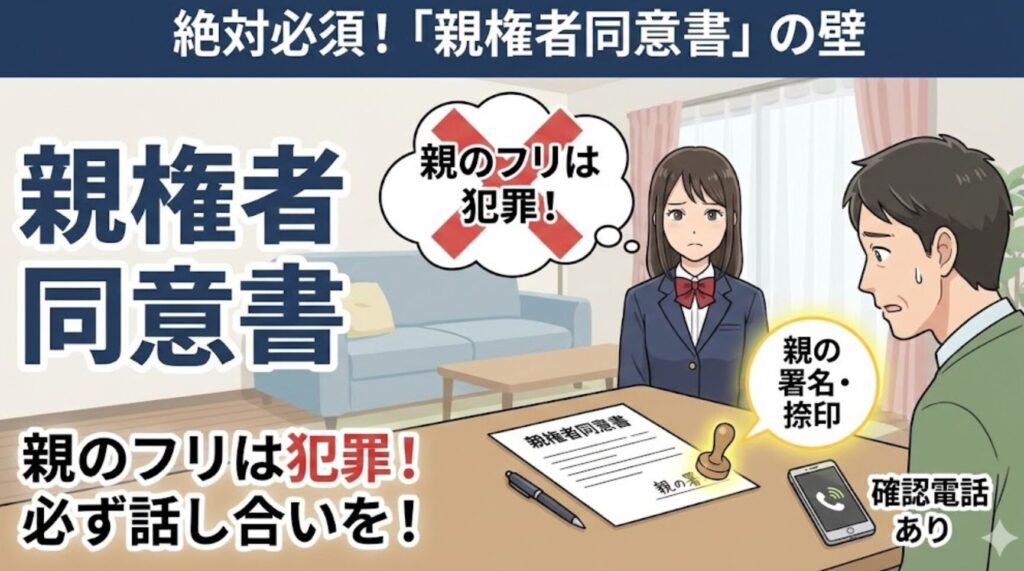 未成年(18歳未満、または18歳でも高校生を含む場合がある)が契約をする場合、親(法定代理人)の同意が絶対に必要です。