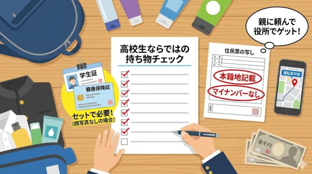 - 多くの教習所では、本人確認書類として「学生証」+「健康保険証」の2点が必要です(顔写真がない学生証の場合など)。