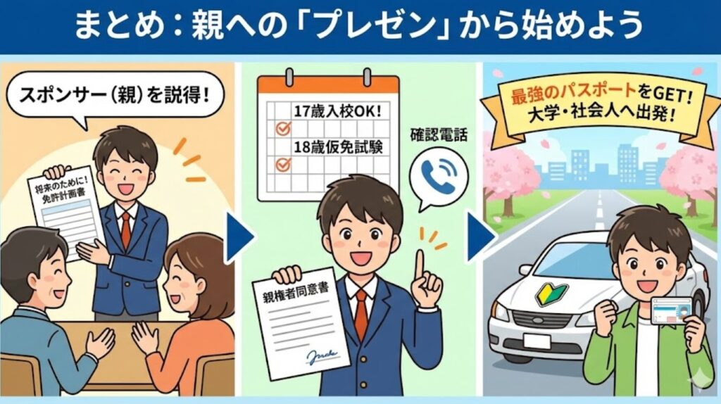 高校生が合宿免許に行くためには、まず「スポンサー(親)」の説得が第一歩です。