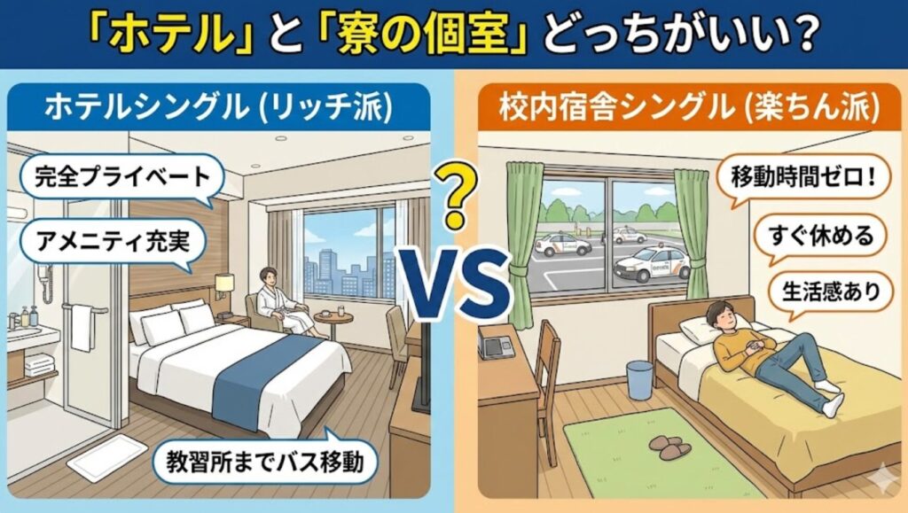 「空き時間に部屋で昼寝したい!」という人は校内宿舎。 「教習所から離れて、完全にプライベートな空間に帰りたい」という人はホテルがおすすめです。