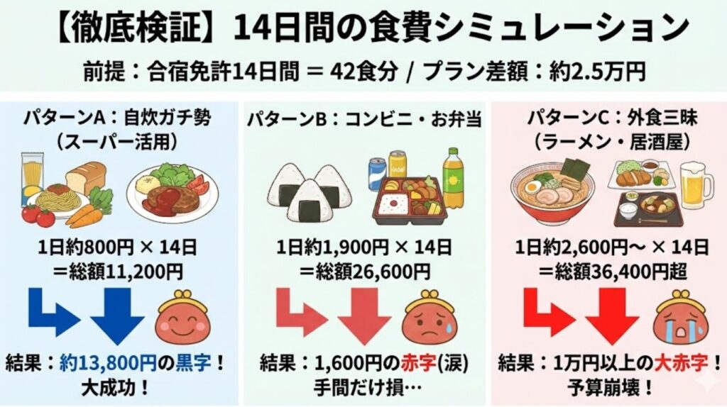 その2万円の差額、本当に得する金額でしょうか? 元・合宿免許手配担当の私(橘)が見てきた中で、一番「後悔」が多いのが、実はこの自炊(食事なし)プランなのです。