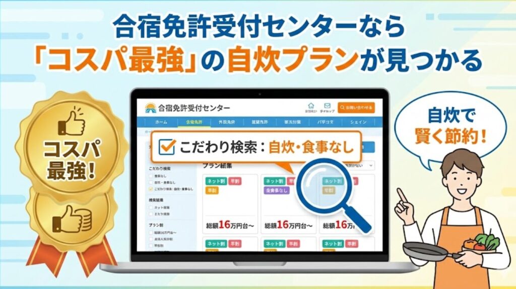>> 「自炊・食事なし」で最安値プランを探してみる|合宿免許受付センター