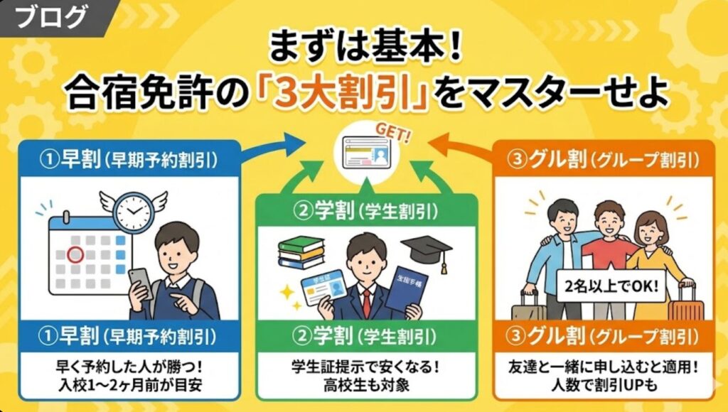 合宿免許の割引には、どこのサイトでも共通する「三種の神器」があります。 まずはこの3つを確実に押さえましょう。