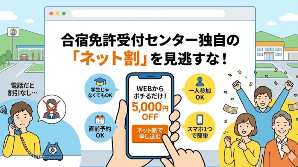 そんなあなたに朗報です。 合宿免許受付センターには、誰でも使える「ネット割」という強力な武器があります。