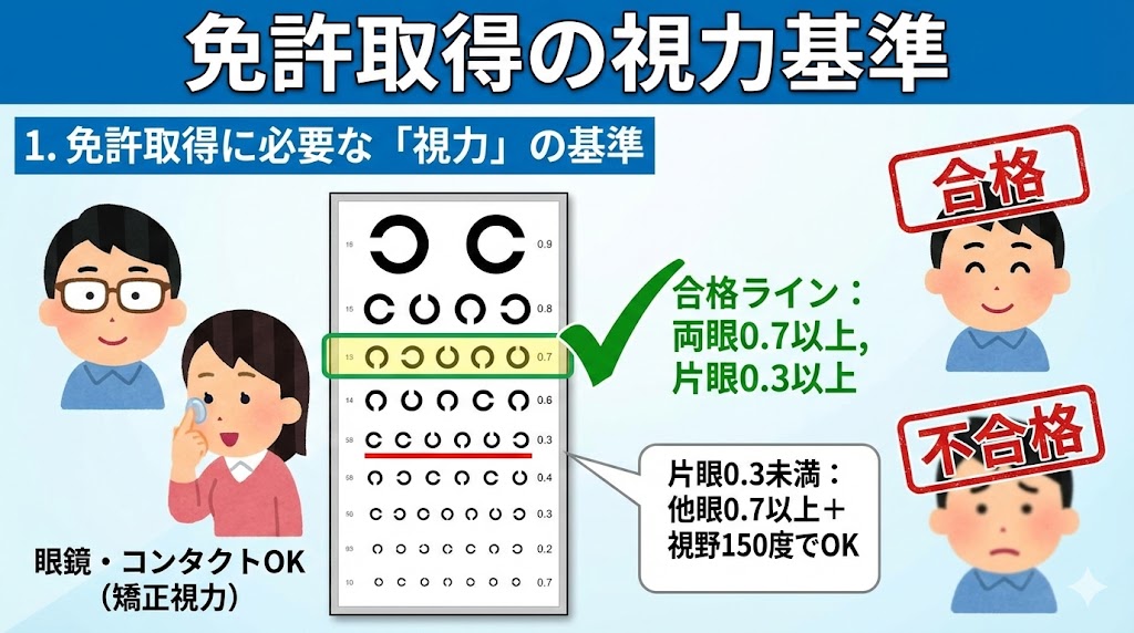 - 基準は「両眼0.7以上」。