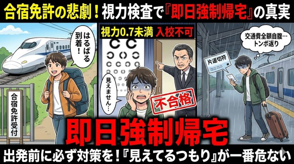「たかが視力」と甘く見ていると、痛い目を見ます。 合宿免許の準備リストには、着替えだけでなく「自分に合った眼鏡・コンタクト」を最優先で入れてくださいね。